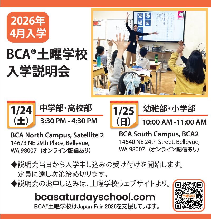 BCA North Campus, Satellite 2 14673 NE 29th Place Bellevue Washington United Statesベルビューにあるベルビュー・チルドレンズ・アカデミー土曜学校の入学説明会です。説明会当日から入学申し込みの受け付けが開始され、定員に達し次第締め切られます。参加をご希望の方は、公式サイトからお申し込みください。
