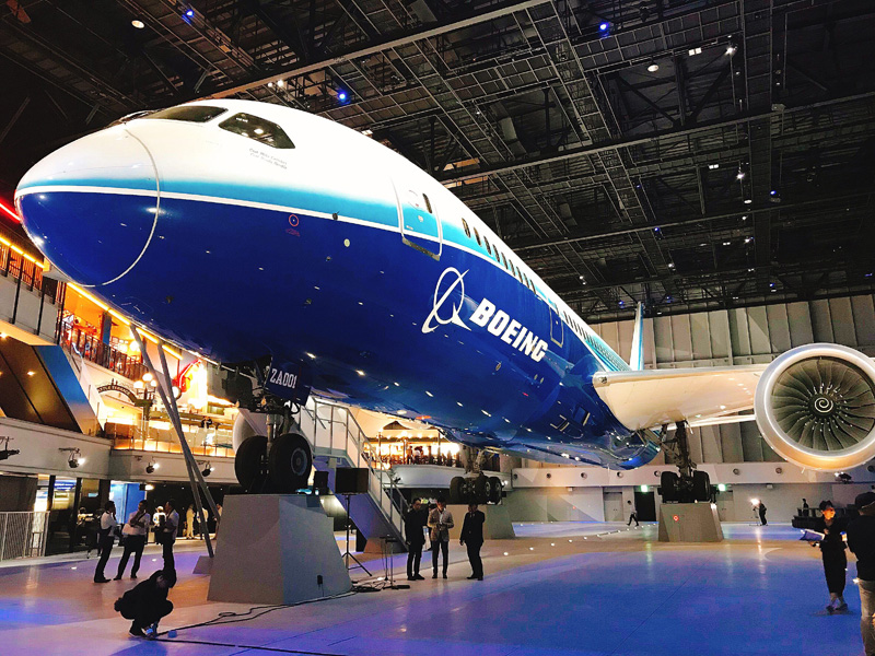 まさかの建物の中に飛行機。そしてよく見ると、我らが787ではありませんか! 外装にボーイング787の絵があったのはコレか! と今さら膝を打つ・・・。