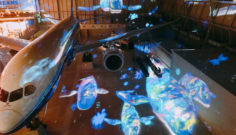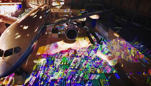 じっと佇む787にプロジェクションマッピングが新しい命を吹き込み、七色の光の中を飛んでいるよう。それを見ているこちらも一緒に空に浮いているような感覚になりました。