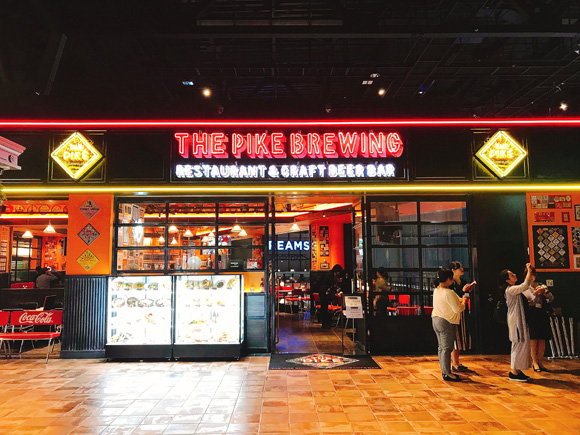 ここは飲食店が入っている商業エリアだそう。なんだかシアトルの名前を使ってくれてありがとうの気持ちになってしまいます。どんなお店が入っているのか、ずんずんと進んで探検してみましょう。まずはシアトルのパイク・プレース・マーケットの近くにある「The Pike Brewing」が見えてきました。