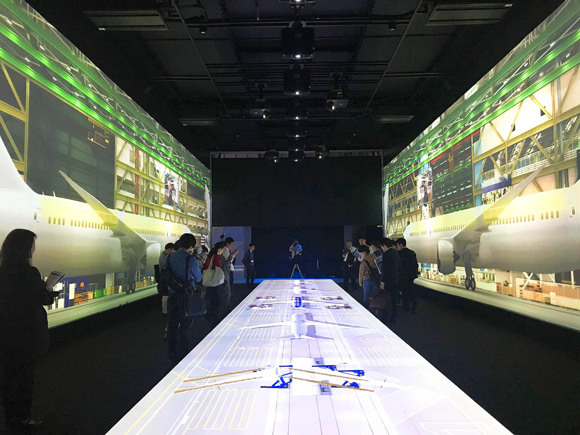 しかもこの787、2009年の冬に初飛行に成功したあの787初号機なのです。(その日は生中継で初飛行を見ていた記憶が。)世界にたったひとつの787初号機がお役目を終えて、これからはここセントレアのフライト・オブ・ドリームズでお客さんを迎えてくれるというわけです。なんて思っていると、照明が暗くなり、急に映像が流れ始めました。普通の映像じゃない!