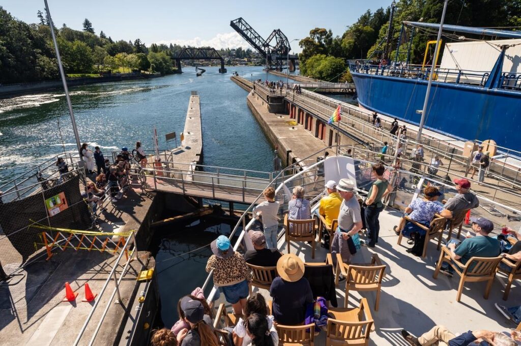 ダウンタウンから車で約15分のところにあるチッテンデン・ロックスは、ピュージェット湾とレイク・ユニオンという水位の異なる海と湖を行き交う船が通る水門として1917年に完成しました。今では年間4万隻以上のヨットやボート、そしてツアーの船舶が通過する、アメリカで最も多くの船舶が利用している水門です。