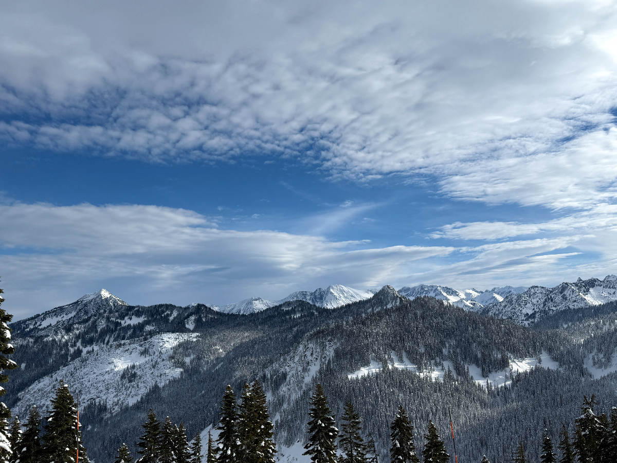 写真はスティーブンズ・パスでホグズバックから乗り継ぐタイ・ミルの終点から見えるカスケード山脈のパノラマビュー。1月10日はきれいな青空が広がりました。翌11日は朝からずっと雨だったので、前日にこの景色が見られてラッキーでした![]()