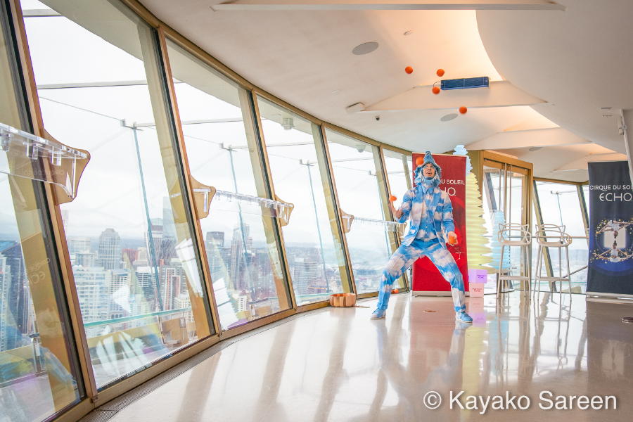 一足先に行われたメディアイベントの舞台は、シアトルのランドマークであるスペースニードルの展望フロア。DOGを演じるジャグラーのフィリッペさん、そしてダブルヘアサスペンションのパフォーマーとして活躍するペネロピさんが登場しました。