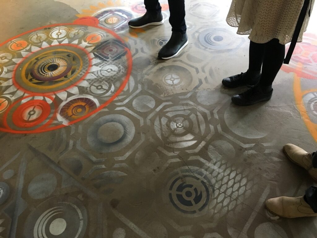 ツアーは、カフェの床に描かれたジョナサン・ワクダ・フィッシャー氏による作品『Fushigi(不思議)』からスタート。今も人知れず制作が続けられ、少しずつ大きくなっているというエピソードに、さっそく好奇心をかき立てられます。