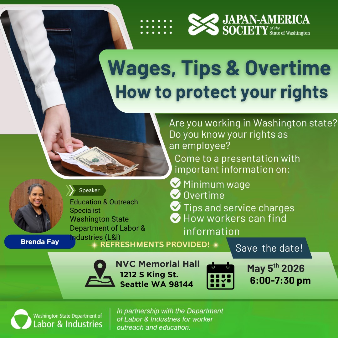 Nisei Veteran's Committee Memorial Hall 1212 South King Street Seattle ワシントン 米国シアトルのNVC Memorial Hallにて、ワシントン州労働産業局(L&I)の専門家を招いた、労働権利に関する説明会が開催されます。 この説明会の注目ポイント ワシントン州の労働法は非常に重要ですが、個人で […]