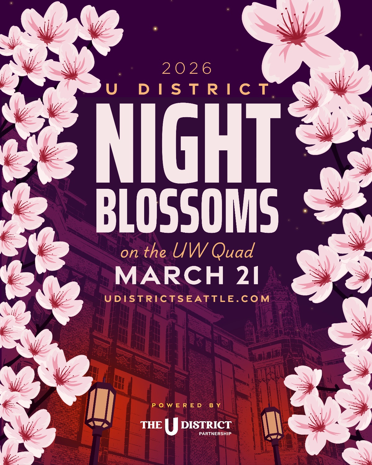 ワシントン大学の広場(The Quad)に並ぶ29本のソメイヨシノがライトアップされます。