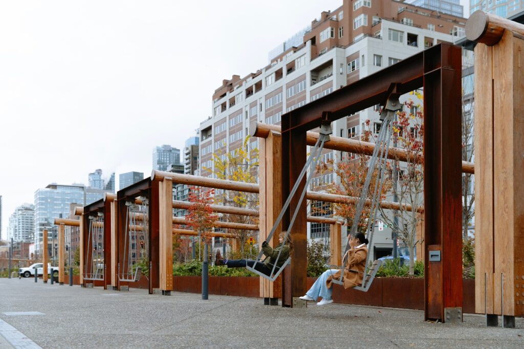 ターミナルの前には歩道と自転車専用レーンがあります。自転車専用レーンには、ネイティブ・アメリカンのアートを施した木製のゲートが並んでいます。その間には海を眺められるブランコ(swing)が取り付けられていて、誰でも乗ることができます。