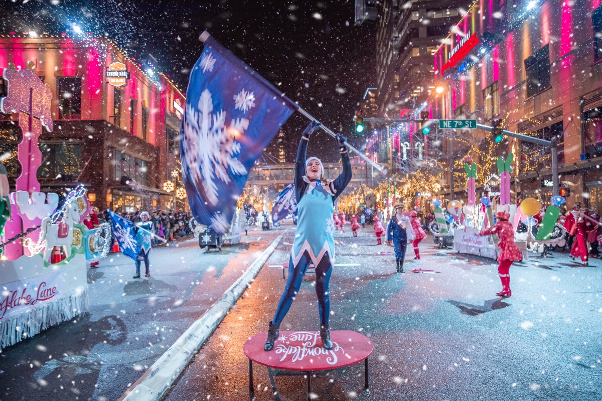 毎日午後7時から開催される豪華なパレードは、2025年で21周年を迎えます。約23分間にわたり人工雪が舞う中、ホリデー・ミュージックに合わせ、打楽器奏者やダンサー、ホリデー仕様のフロートが、ベルビュー・スクエアとリンカーン・スクエアの間の Bellevue Way をパレードします。