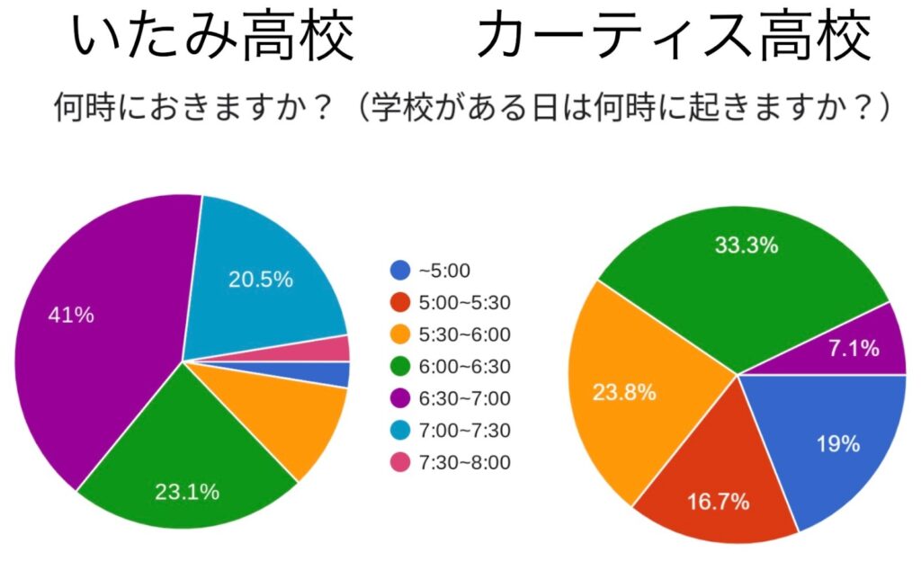 その過程で、日米両方の高校で同じ年齢の生徒が学校生活に関する日本語のアンケートに回答して高校生活を比較しました。CHS(Grade10 44名)の生徒と兵庫県立伊丹高校(伊丹高校)(一年生39名)の生徒の双方のアンケート結果から得られた情報を見たCHSの生徒の反応はとても興味深いものでした。
