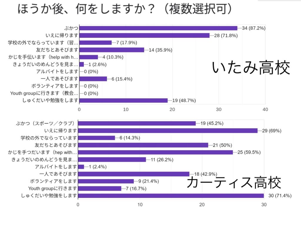 続いて、放課後の活動について、伊丹高校の生徒の87%が放課後に部活動をすることにも大きな反響がありました。こちらでは Sports と Clubs(文化系の活動で頻度はさまざま)と別のカテゴリですが、日本では両方を部活(クラブ)と呼び、文化部の中には平日ほぼ毎日活動する部活が多くあります。