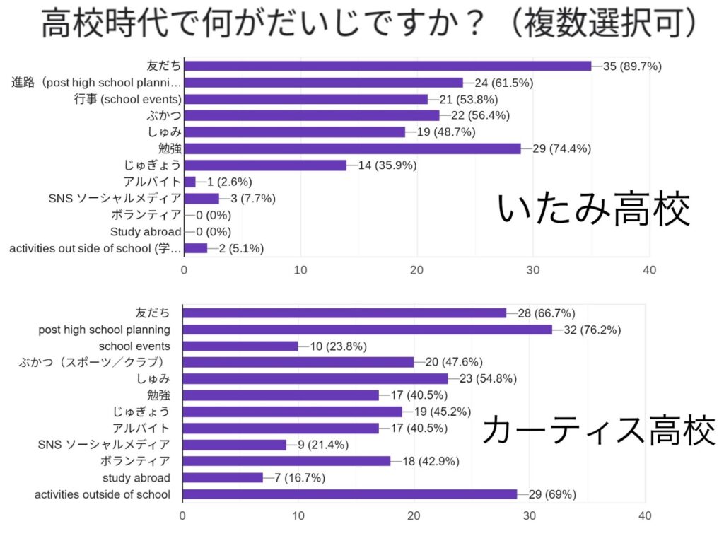 最後に、高校時代で大事なものについての回答を見ると、CHSの生徒は進路や学校外での活動を大切にしているのに対して、伊丹高校の生徒は友人や勉強など学校内での活動に重きを置いていることがわかります。日本の高校生は学校で長く時間を過ごすため、学校で過ごす時間の違いが反映されているのではないかと思いました。
