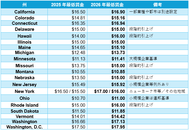 最低賃金の改訂(1月1日より施行された州のみ掲載)