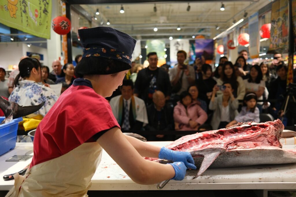宇和島屋ベルビュー店で、日本から来訪する愛媛県宇和島水産高校の生徒たち ― 通称「フィッシュガールズ」 が、一本のマグロを丸ごと解体しながら日本の魚のさばき技術... -
