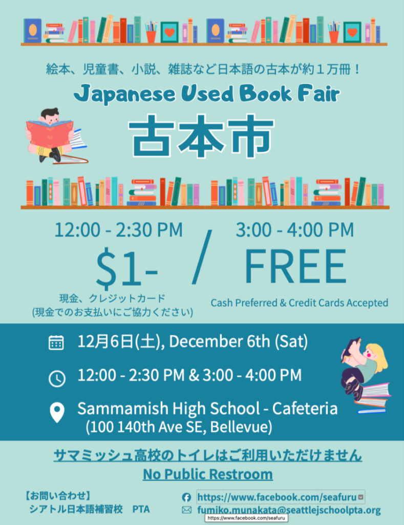 シアトル日本語補習校PTA主催の古本市。日本語の絵本、児童書、小説、雑誌など約1万点が販売されます。 開催時間 12:00-2:30 pm: 1冊 $1〜3pm-4pm:全冊無料 駐車 Samm... -