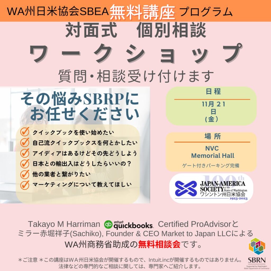 ワシントン州日米協会のスモールビジネス部が提供する対面式の個別ワークショップ。ビジネスコンサルタント、QuickBooks プロアドバイザー、マーケティングと日米間の輸... -